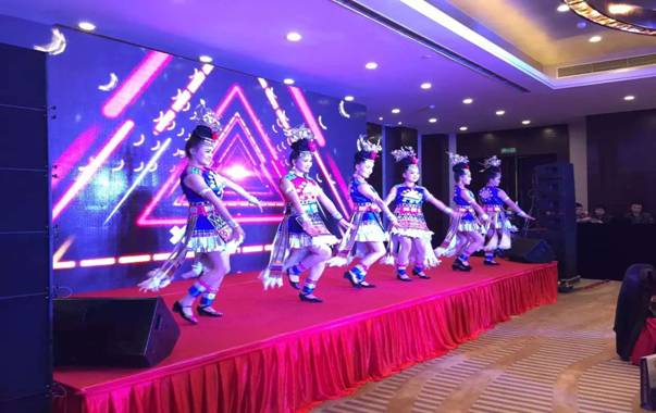 图四:美丽的苗家姑娘载歌载舞,与各位嘉宾、领导互动,晚会现场充满喜庆与欢乐。