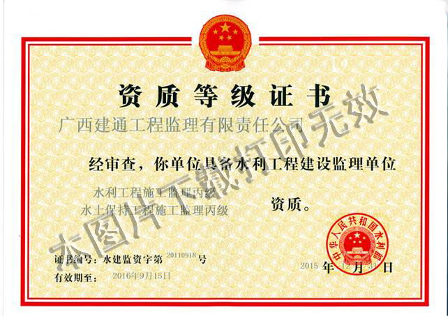 集团公司近来好消息接憧而至,2016年1月8日,中华人民共和国水利部网站发布公告,广西建通工程监理有限责任公司申请的水土保持工程施工监理专业丙级资质已经通过审批,今后我集团可承揽的水利监理业务有:承担Ⅲ等水土保持工程的施工监理业务、Ⅲ等(堤防3级)以下各等级水利工程的施工监理业务。