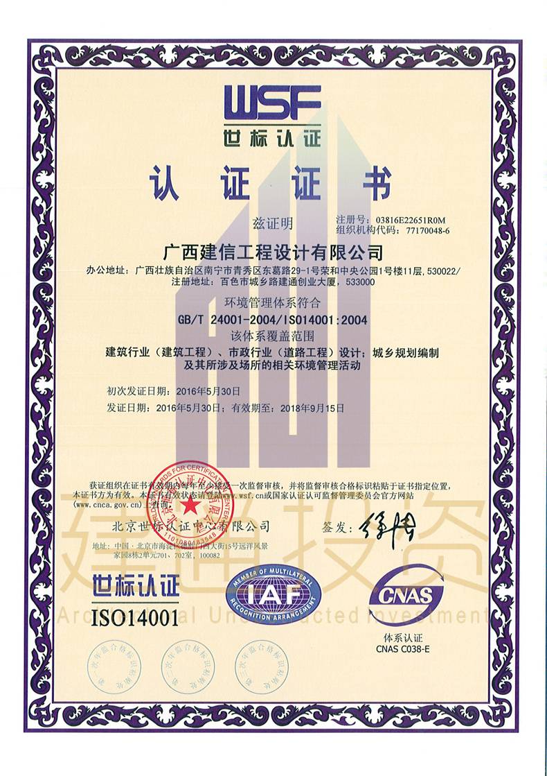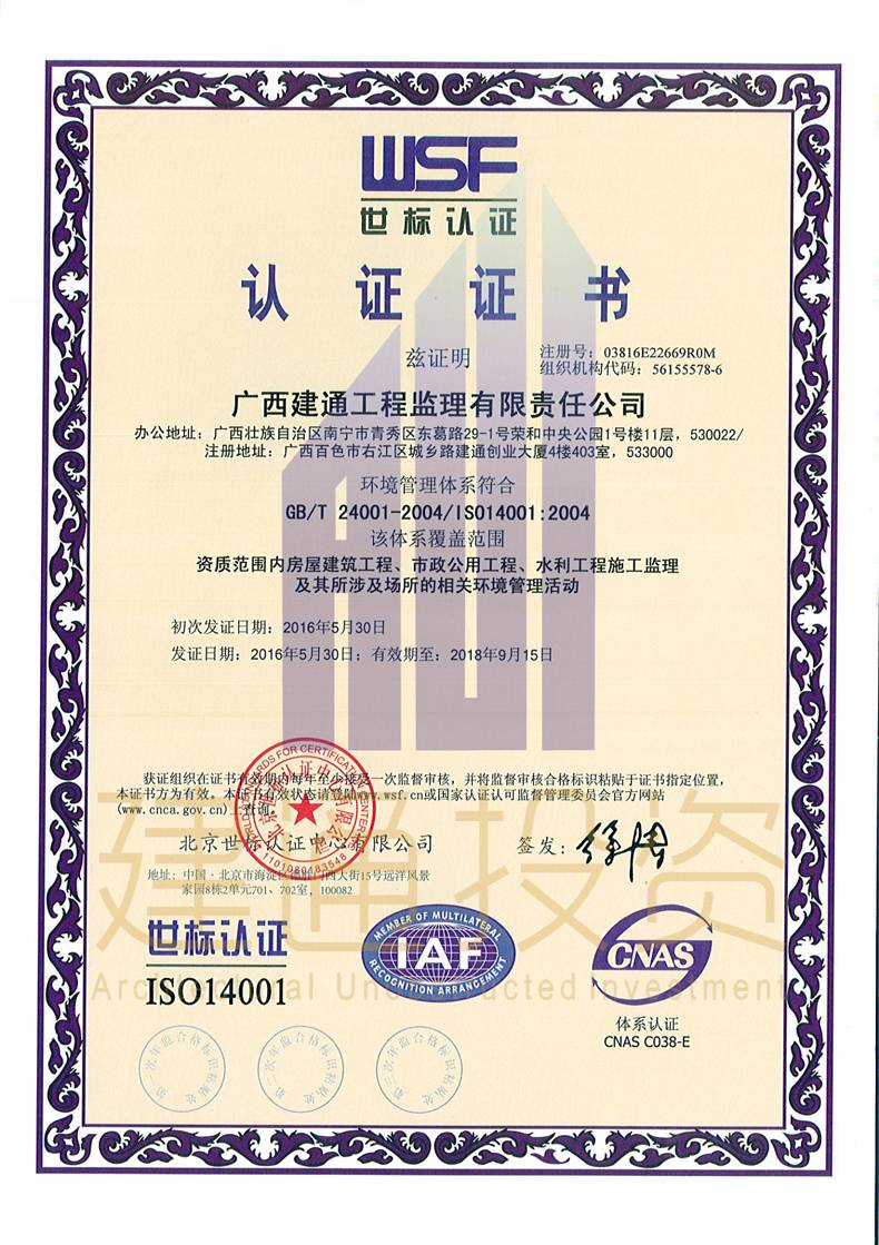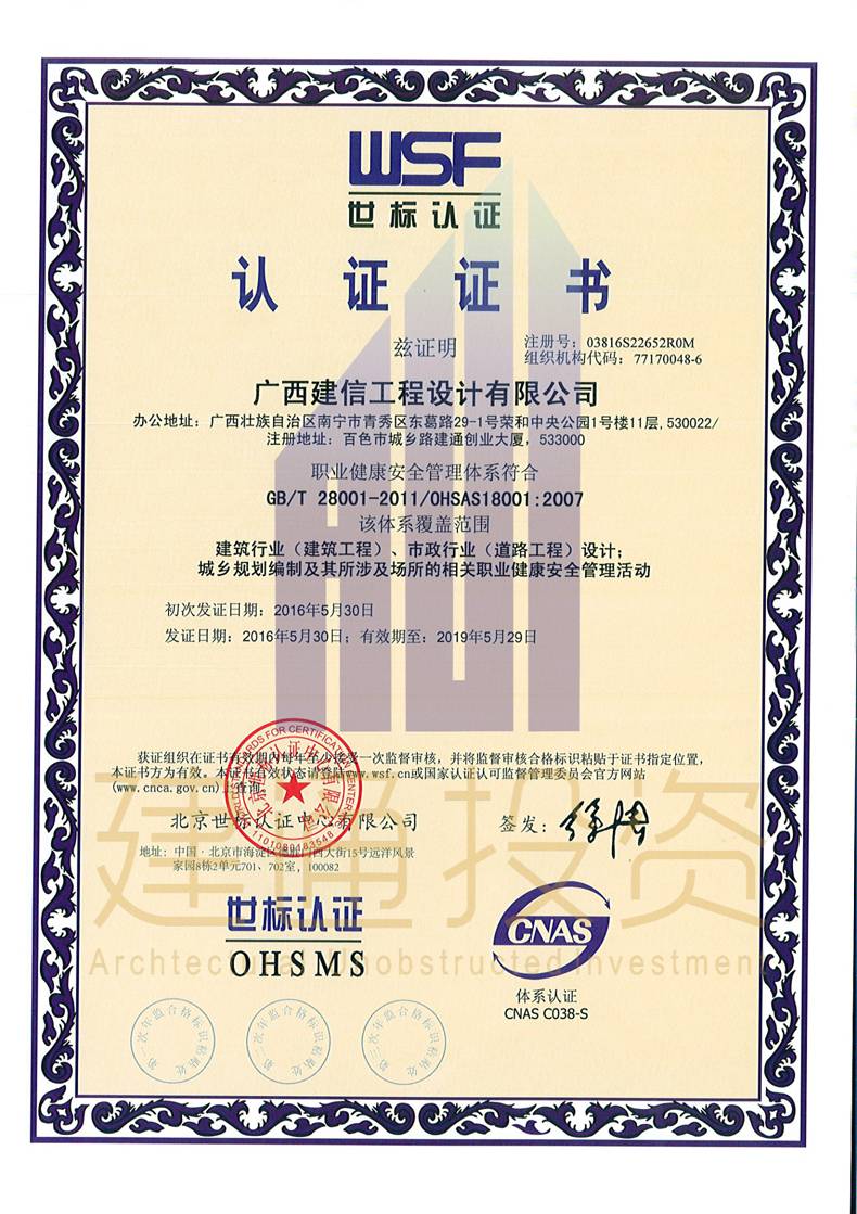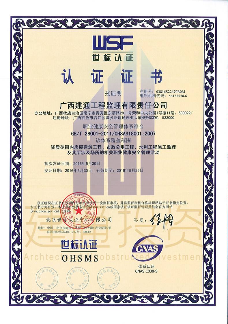 北京世标认证中心有限公司分别于2016年3月23日-3月25、3月30日-4月1日两个阶段对我集团旗下三家子公司sanyi三亿(中国)、广西建信工程设计有限公司、广西建通工程监理有限责任公司进行了《质量管理体系》(ISO9001::2008)、《环境管理体系》(ISO14001:2004)和《职业健康安全管理体系》(OHSAST18001:2007)审核,此次审核工作得到集团领导和各部门员工的大力支持,保证了审核的顺利通过和体系的成功引进。