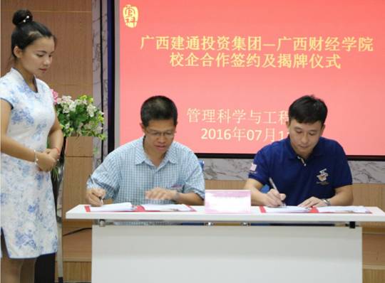 2016年7月11日,广西三亿网页版集团-广西财经学院校企合作签约及揭牌仪式在广西财经学院隆重举行。集团邓安杰董事长带领集团高层及监理公司、检测公司代表,广西财经学院总会计师宁旭初带领的招就处、管理学院领导班子成员及师生代表出席了签约及揭牌仪式。仪式由管理科学与工程学院工程造价系主任梁华主持,宁旭初总会计师、邓安杰董事长分别作了热情洋溢的发言。