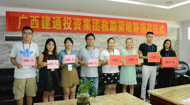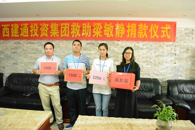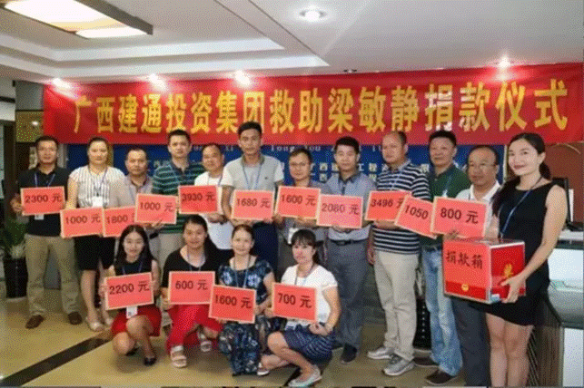 众志成城,真情涌动。在集团董事长邓安杰就梁敏静身患重病作出“待岗就医期间照常发放基本工资并增加生活津贴,仍享受集团的各项福利,集团第二秘书处全力协助配合梁敏静家属办理医疗及住院手续”的指示后,集团员工发起了以“少喝一杯可乐,少抽一包香烟,少吃一个雪糕,延长一个生命,拯救一个家庭”为主要内容的《建通大爱·传递正能量》募捐活动,积极为梁敏静捐款献爱心,短短一天时间就募捐了45740元,其中百色总部24230元,南宁总部21510元。2016年9月,集团在得知梁敏静的医疗总费用已高达245435.72元(其中医疗保险报销部分为196527.32元,个人支付部分从集团45740元的捐款中拨付,已超支3168.4元)时,集团再次发出捐款倡议,也是短短数日,集团上下纷纷慷慨解囊,又筹集善款59594元,再次为梁敏静解决了燃眉之急……