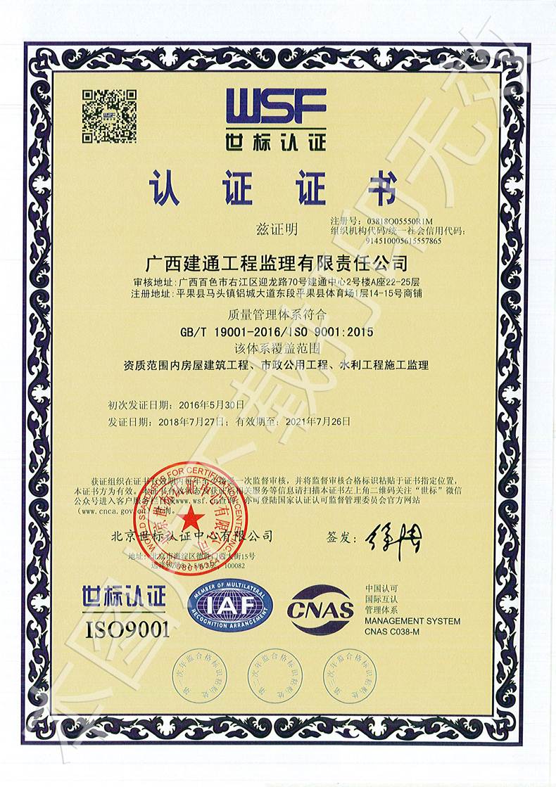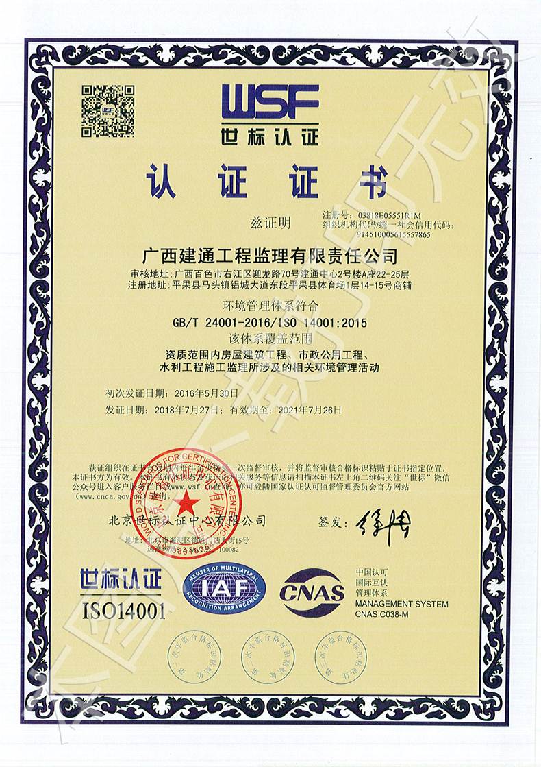 广西建通工程监理有限责任公司三大管理体系认证证书