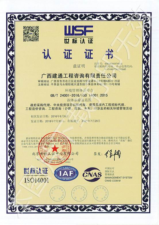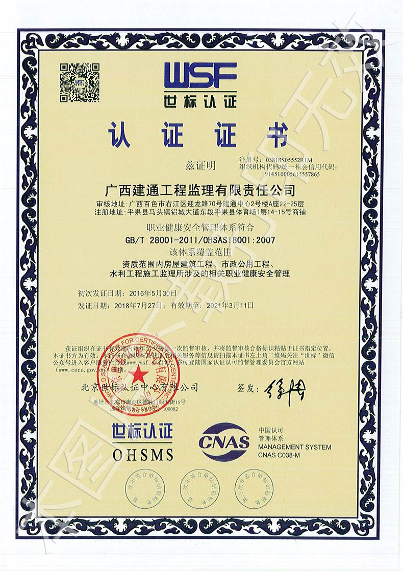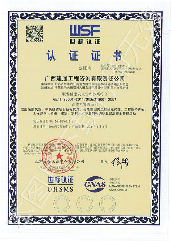 北京世标认证中心有限公司分别于2018年6月27日-6月30日、6月27日-7月3日、7月3日-7月6日对我集团旗下:广西建信工程设计有限公司、sanyi三亿(中国)、广西建通工程监理有限责任公司共三家子公司进行了《质量管理体系》(ISO9001:2015)、《环境管理体系》(ISO14001:2015)和《职业健康安全管理体系》(OHSAST18001:2007)评审。在集团领导和各部门同事的大力支持配合下,保证了此次审核工作的顺利通过,并于2018年8月8日获得了世标认证委员会颁发的合格证书。这次世标认证审核的通过对集团业务的发展、招投标等方面将产生积极的影响力,对不断提高管理水平、员工环保意识以及提高公司市场竞争力有很大的促进作用。