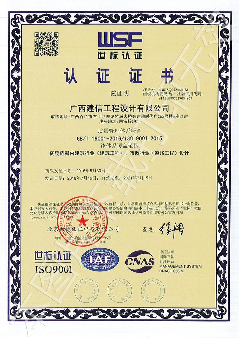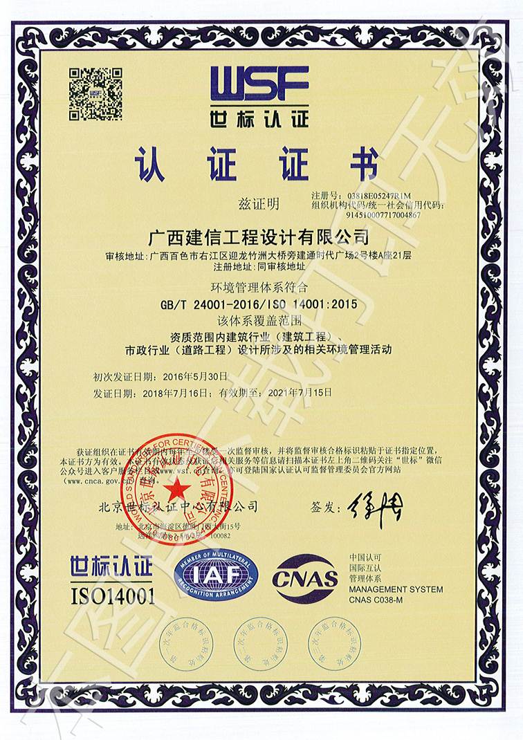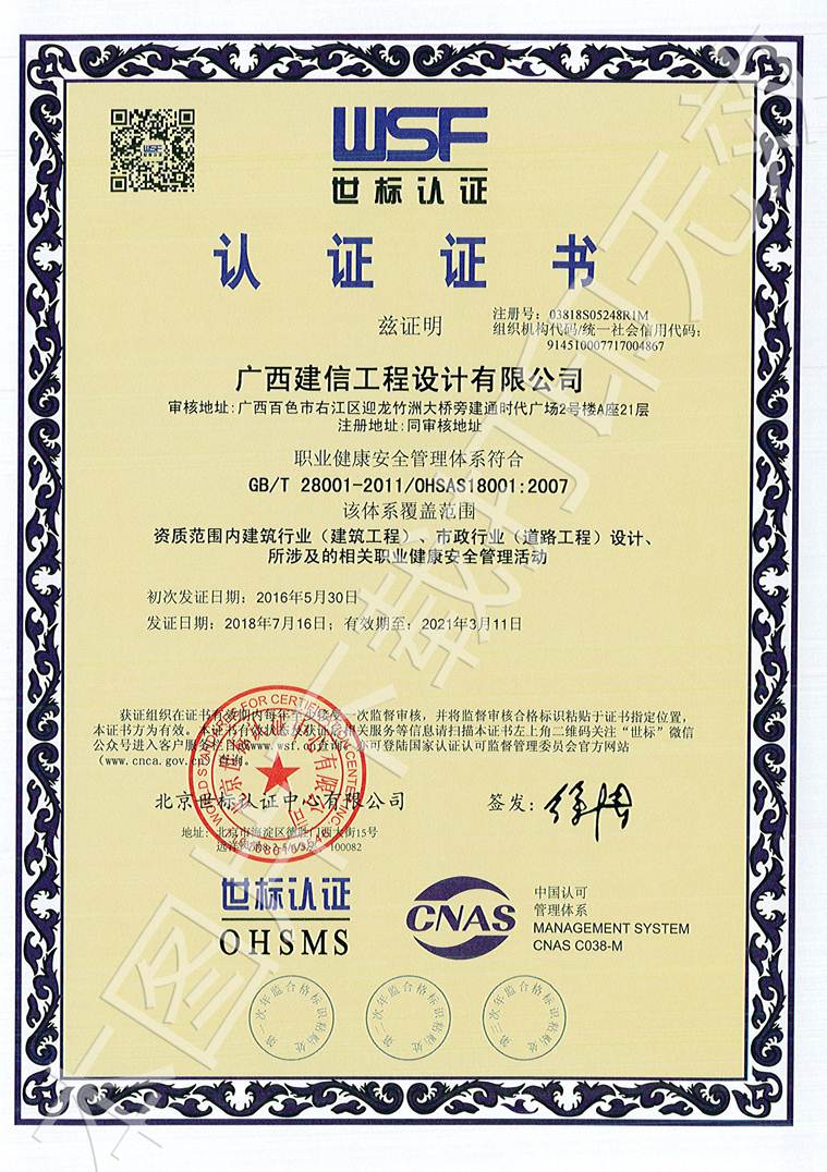 广西建信工程设计有限公司三大管理体系认证证书