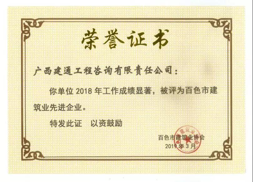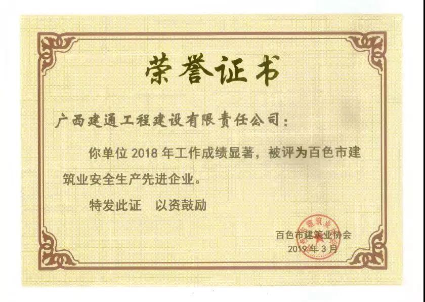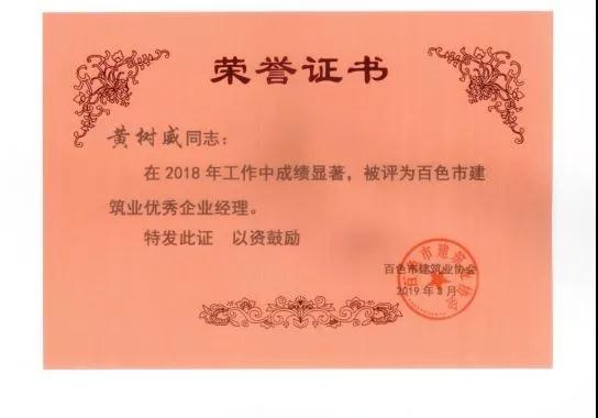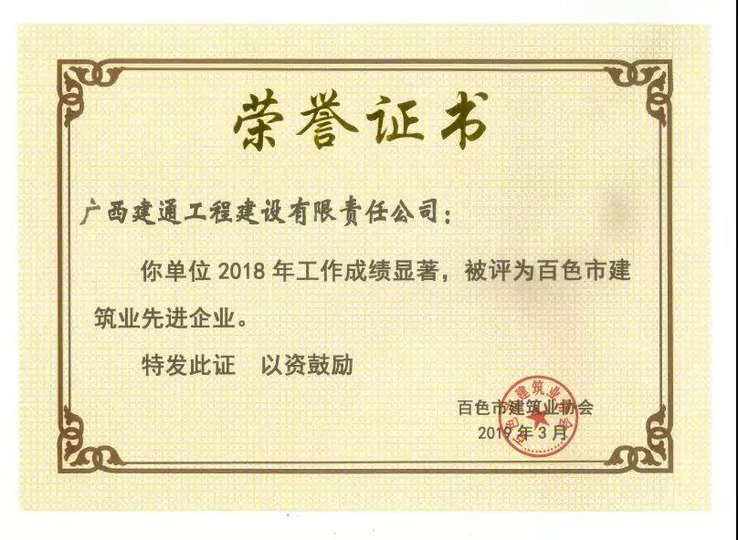 二、广西建通工程建设有限责任公司荣获《2018年度百色市建筑业先进企业》、《2018年度百色市建筑业质量管理先进企业》、《2018年度百色市建筑业安全生产先进企业》、黄树威副董事长荣获《2018年度百色市建筑业优秀企业经理》荣誉称号;
