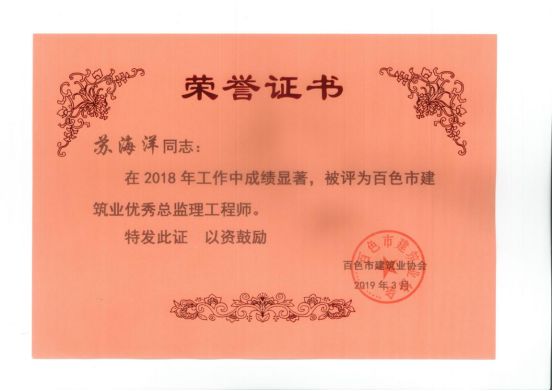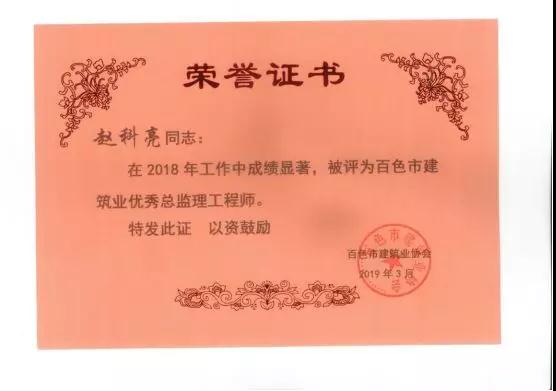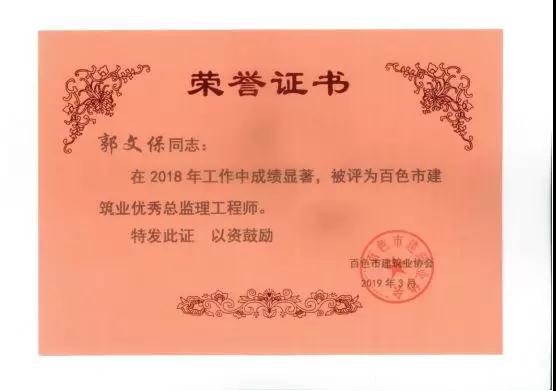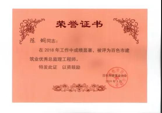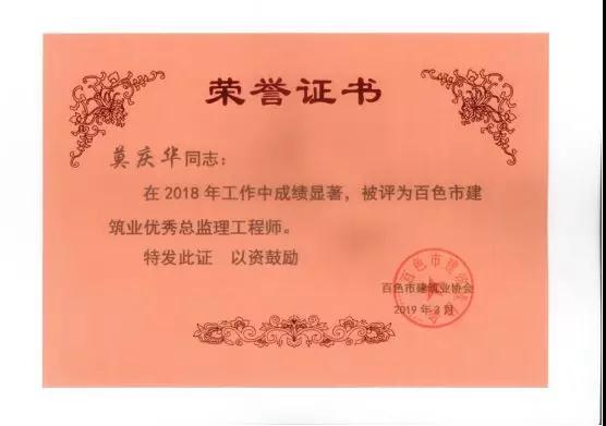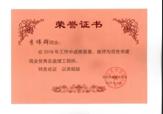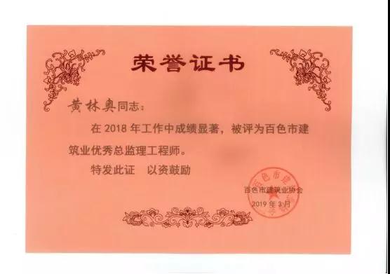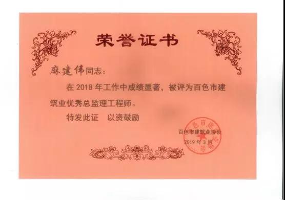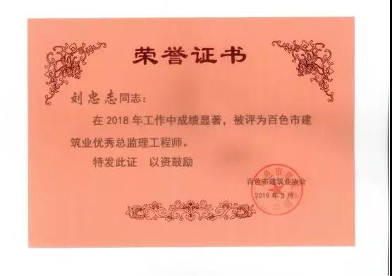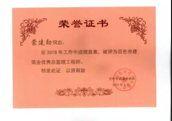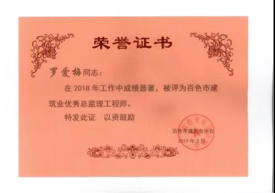 三、广西建通工程监理有限责任公司名下技术总监:刘忠志、蒙建勋、黄承理、赵科亮、麻建伟、卢贵修、黄慧妮、陈 垌、苏海洋、罗爱梅、陈彩绣、黄林奥、莫庆华、李伟群、郭文保等15位荣获《2018年度百色市优秀总监理工程师》荣誉称号;