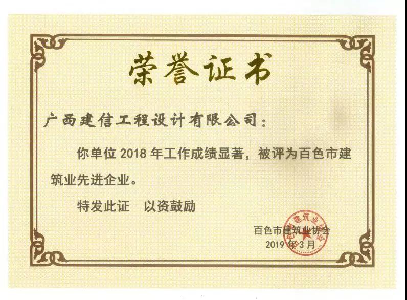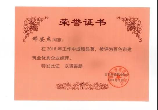 一、sanyi三亿(中国)荣获《2018年度百色市建筑业先进企业》、邓董事长荣获《2018年度百色市建筑业优秀企业经理》荣誉称号;