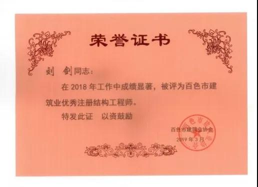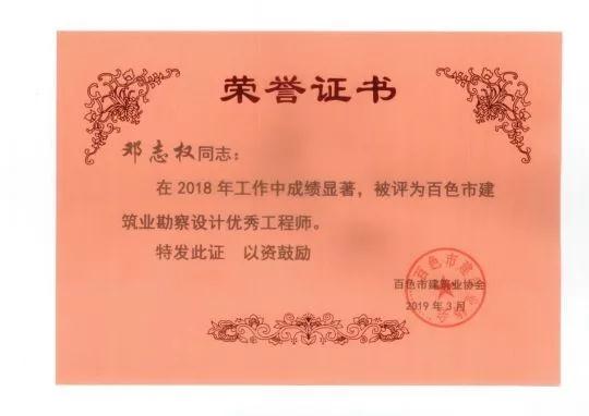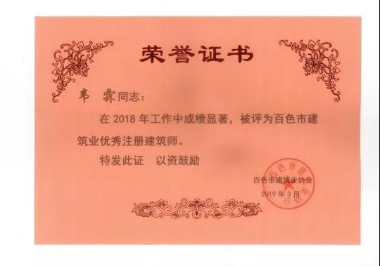 四、广西建信工程设计有限公司荣获《2018年度百色市建筑业先进企业》、韦霖荣获《2018年度百色市勘察设计优秀注册建筑师》、刘剑荣获《2018年度百色市勘察设计优秀注册结构师》、杨莹、邓志权荣获《2018年度百色市勘察设计优秀工程师》的荣誉称号。