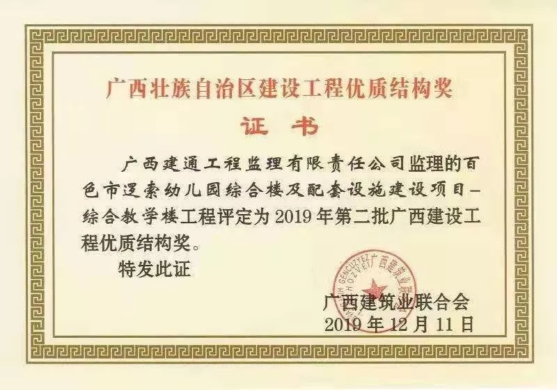 近日,广西建筑业联合会、百色市建筑业协会分别公布了2019年广西建设工程优质结构、优质工程、建筑施工安全文明标准化工地奖项评选结果,三亿网页版集团旗下子公司广西建通工程监理有限责任公司作为评选单位,多个项目获得了殊荣。标志着我集团工程建设管理迈上更高平台,均得到了各主管部门的高度认可。
