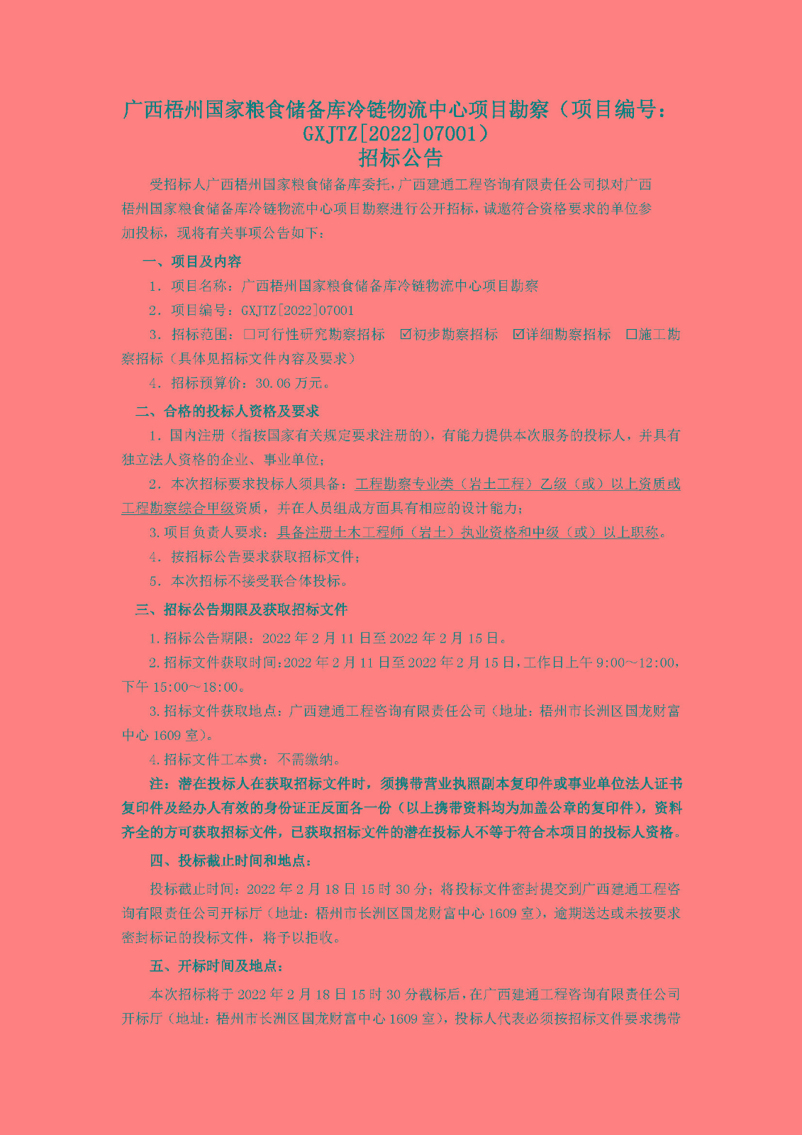 广西梧州国家粮食储备库冷链物流中心项目勘察(项目编号: GXJTZ[2022]07001) 招标公告