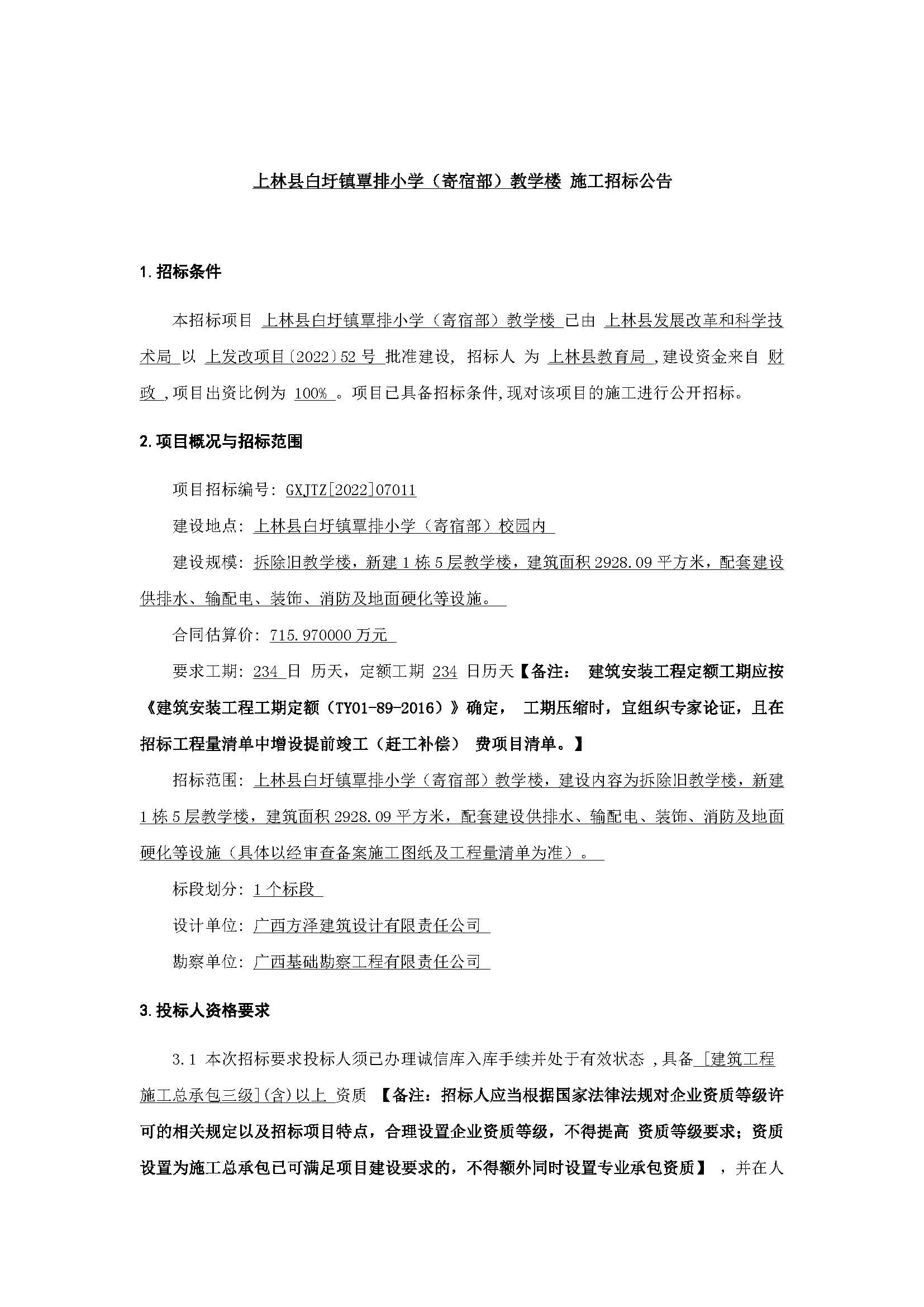 上林县白圩镇覃排小学(寄宿部)教学楼施工招标公告