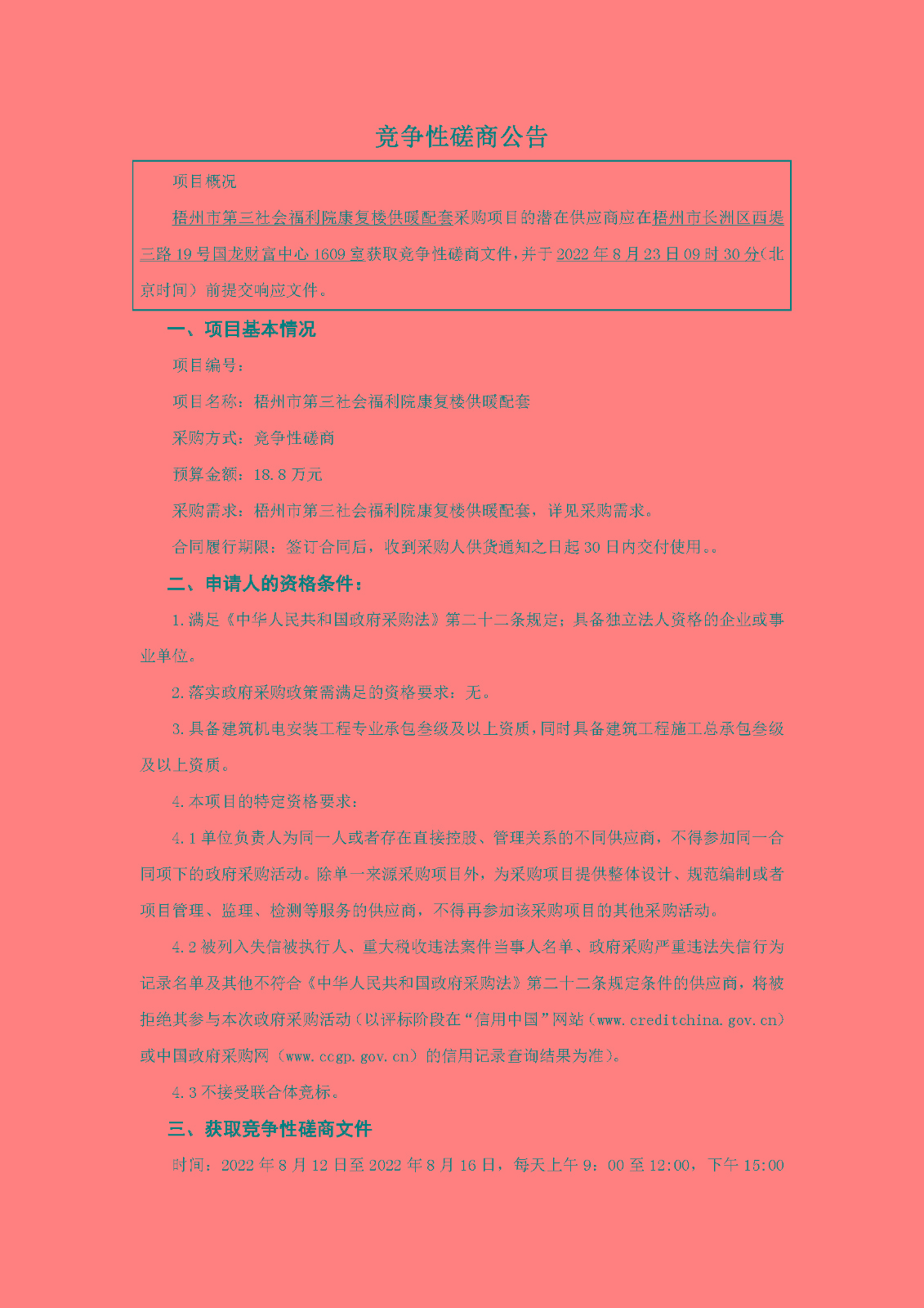 梧州市第三社会福利院康复楼供暖配套竞争性磋商公告