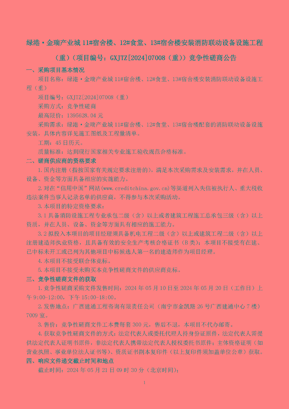 绿港·金瑞产业城11#宿舍楼、12#食堂、13#宿舍楼安装消防联动设备设施工程 (重)(项目编号:GXJTZ[2024]07008(重))竞争性磋商公告