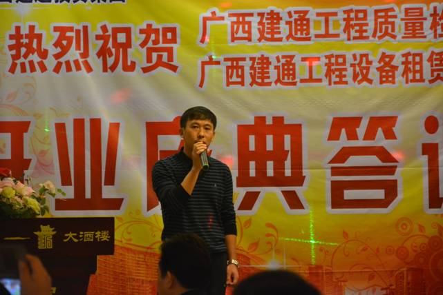 随后,集团副董事长兼桂昌公司总经理、设备租赁公司总经理黄树威也对开业活动做出了庆典致辞。他表示:广西建通工程设备租赁有限责任公司是广西三亿网页版集团于2013年4月注资100万元成立的具有独立法人资格的子公司,业务范围包括各种建筑设备、机械设备租赁的专业租赁公司,目前主要服务于百色市场。一年多来,设备租赁公司在集团的正确领导下,以提供“专业、迅速、安全”服务为目标,着重营造集安装、拆除、维修于一体的高素质员工队伍,先后参与了百色地区多项重点大型工程建设,与一批优秀的建筑企业建立了良好合作关系。现公司拥有全新卡特320D挖掘机一台、外架钢管1000吨,扣件9万套及相关机械设备,全部用于建筑工地的施工生产需求。2015年建通设备租赁公司将全心全意为客户服务,急客户之急、想客户所想,力争做到让每一位合作伙伴用得省心!用得称心!用得放心!