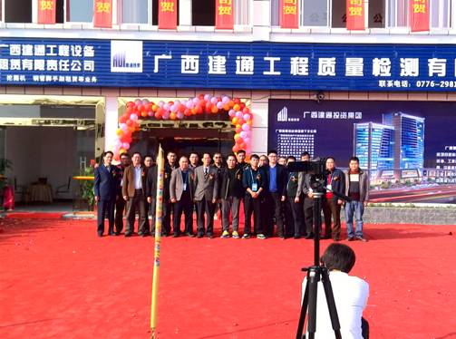 2015年1月17日下午,阳光明媚,微风和煦。在百色市龙景区龙旺路新开发的荣新机械城工程机械市场,集团检测公司、设备租赁公司入驻的一幢两层楼房,修葺一新。大门前广场鲜花锦簇,彩旗招展,人头攒动,鼓乐喧天。众多嘉宾与集团领导及集团员工一道,在鲜艳的红地毯两旁翘首期盼。15时58分,现场鞭炮齐鸣,掌声雷动,广西建通工程质量检测有限责任公司、广西建通工程设备租赁有限责任公司开业揭牌仪式隆重举行!